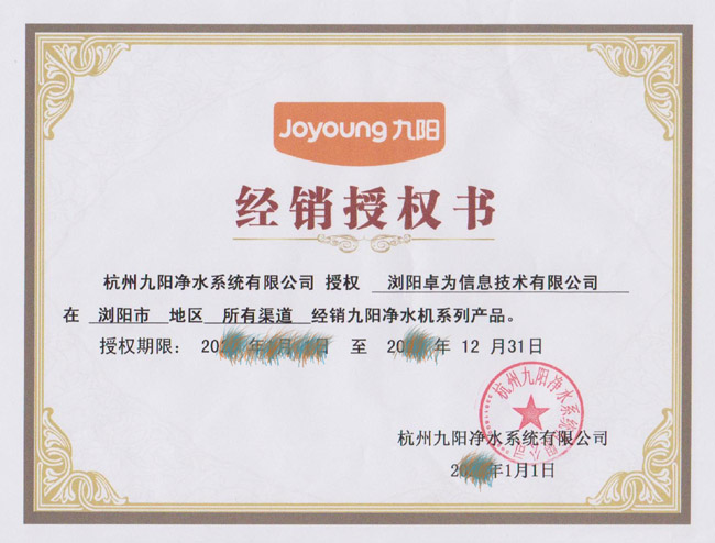 九阳授权浏阳地区经营证书